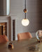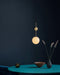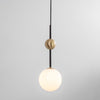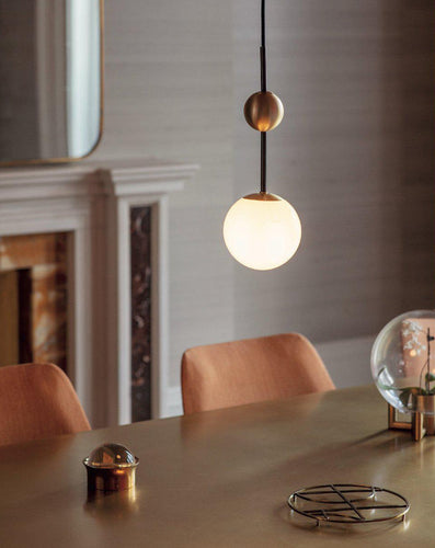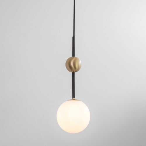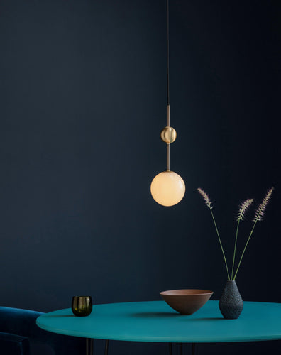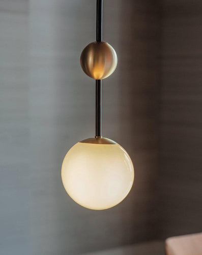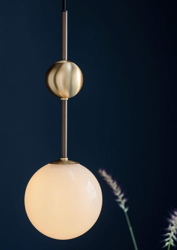 The Rift pendant light by Bert Frank - clean and crisp design – essentially, one small brass sphere positioned above a larger frosted glass globe – that plays with form and balance.