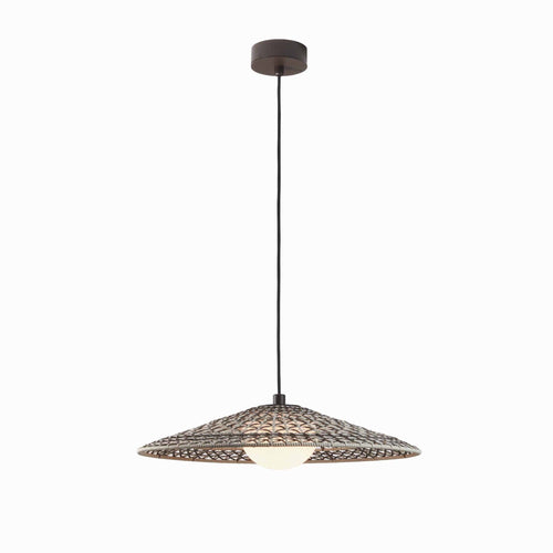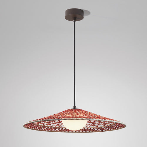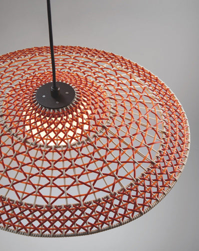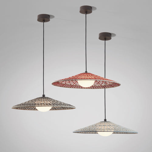 The Nans Outdoor Pendant Light by Bover features a hand-woven shade with a complex weave pattern, composed of various weaving techniques in a single layer. This fixture stands apart from other pieces in the collection by incorporating an elliptical polyethylene diffuser, which filters and reduces glare from the light. With Nans, Bover wanted to highlight the craftsmanship of the lampshade and discovered a different way of weaving by combining different colours and formats to create a true Mediterranean style.