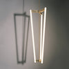 Tube chandelier, by Michael Anastassiades, was designed in 2006 as the first light for the Michael Anastassiades collection. The design for this fixture began as an exercise of subtraction. The challenge was to suspend the minimum number of incandescent light tubes in a sculptural configuration to form a vertical chandelier. The supports needed to be discreet so when lit, only three glowing lines would be seen.