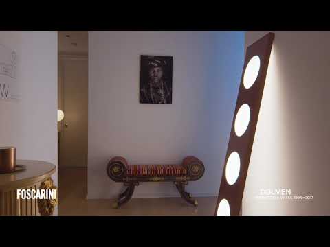 The Dolmen floor lamp by Foscarini is like a painting in an art gallery or a domestic sculpture, the floor lamp rests against the wall, diffusing light reflected onto the wall and direct light into its surroundings.