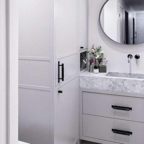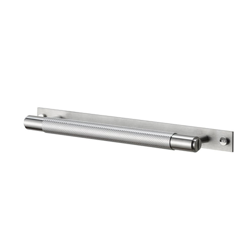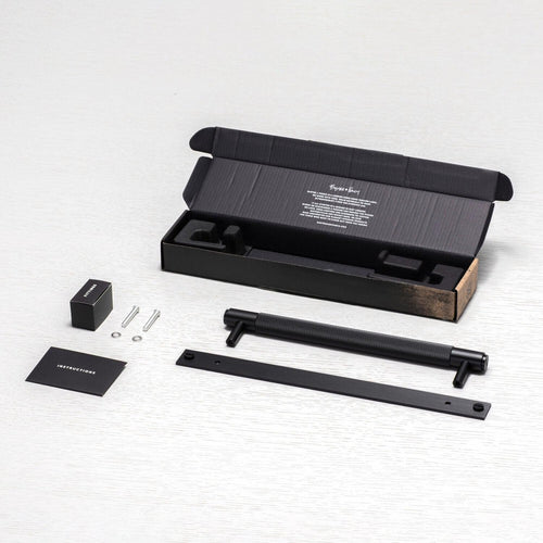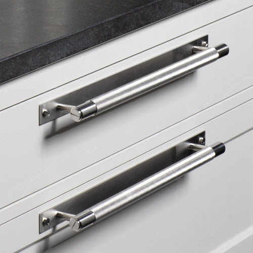 A pull bar made from solid metal by Buster+Punch. This pull bar features diamond-cut, cross-knurl pattern and is refined by hand. They work great on cabinet doors, wardrobe drawers, cupboards, kitchen units and just about anything that can open. Available in 4 metal finishes: steel, brass, smoked bronze and black.