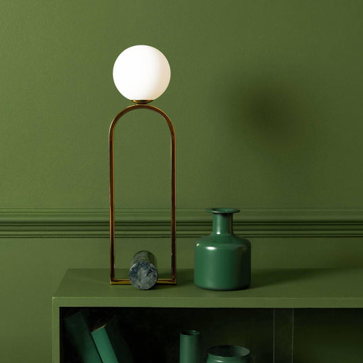 Translation missing: en.product_price.item.price.range_htmlOriginal price £350.00£280.00from £280.00Current price £280.00| /The Marble Curve floor lamp, by Houseof. The sculpted green marble base mounts 2 curved brass arms, each topped with opal glass pill shades, which ...