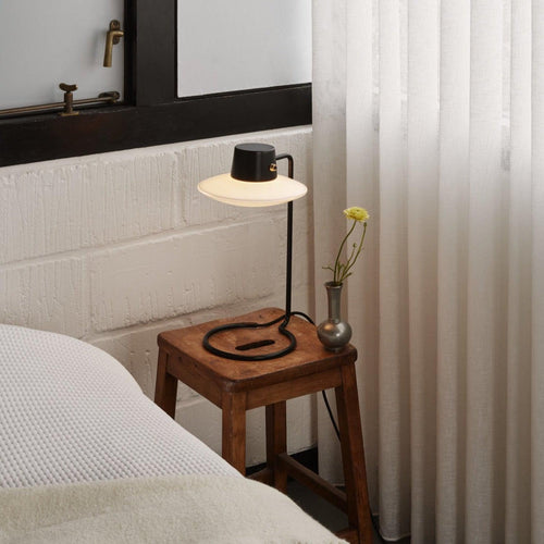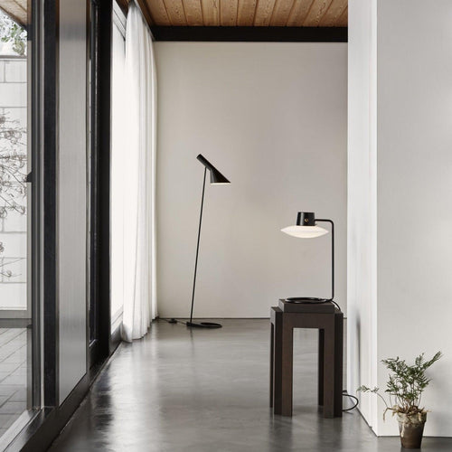 The AJ Oxford table lamp by Louis Poulsen emits a pleasant downward directed light, which harmoniously illuminates the surface below it through the soft transparency of the three-layered mouth-blown opal glass. The variant without the top metal shade, the milky opal glass shade provides further glow to form an alluring halo around the fixture.