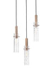 The hand-made glass cylinder is available as either a square or grid cut and the quadrangular steel base comes in Brushed Brass, Dark Copper and Gold finishes. The cluster includes a matching gold / copper / brass ceiling plate.