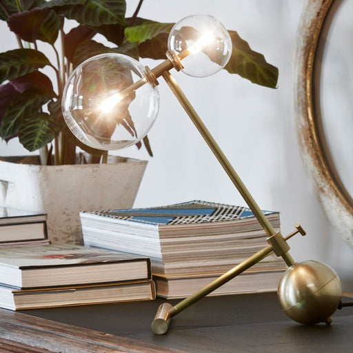 Translation missing: en.product_price.item.price.range_htmlOriginal price £1,099.00from £879.00from £879.00Current price £879.00| /The Schwung Zosia table lamp features twin points of light supported by slender rods, suspended within glass orbs. This design creates a dynamic i...