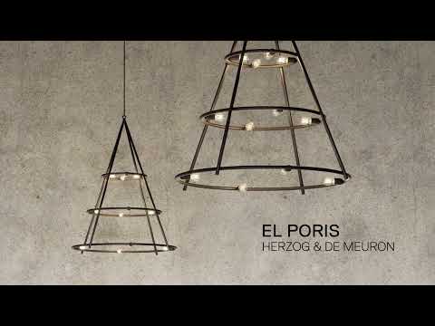 El Porís, by Artemide, is a modern chandelier, light and rigorous but scenic and sculptural. An elementary and geometric structure, with big dimensions, welcomes in the traditional E27 light bulbs attacks leaving the freedom to choose which sources to use. Three steel tubes with decreasing diameter are joined by four vertical uprights.