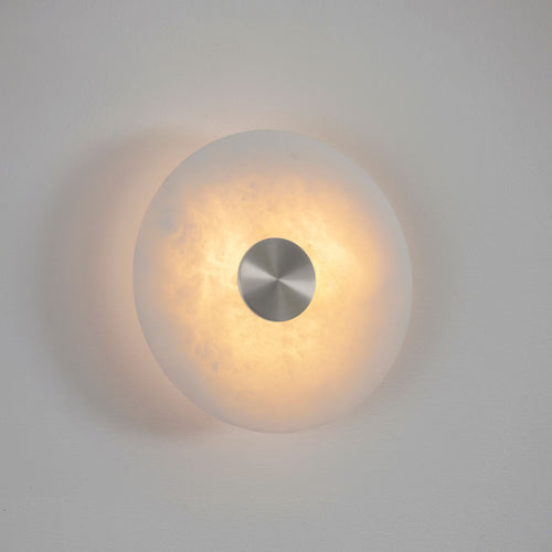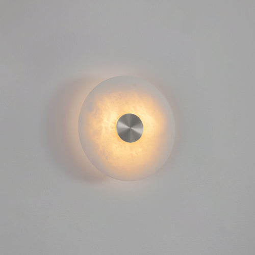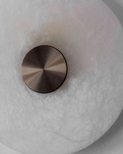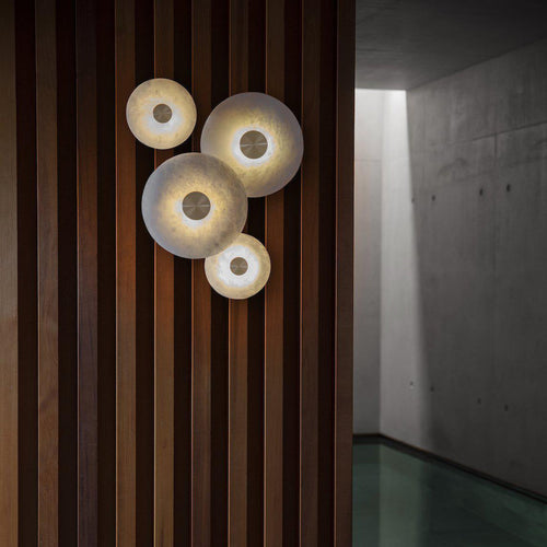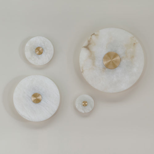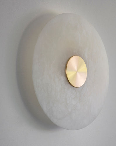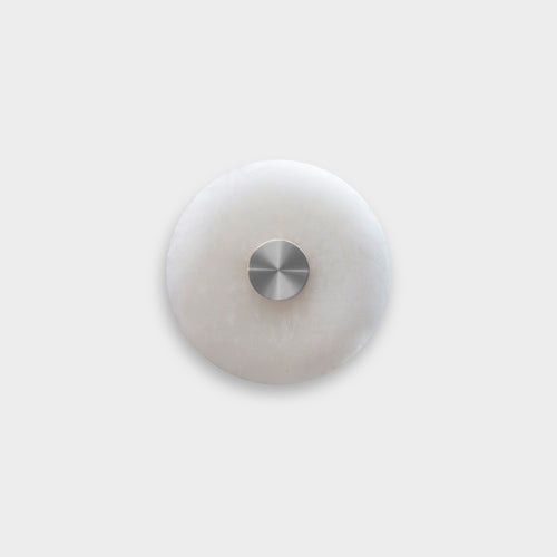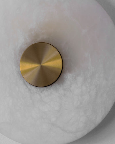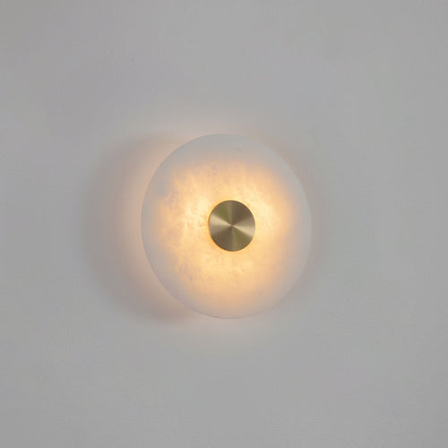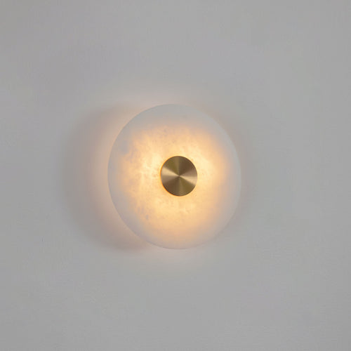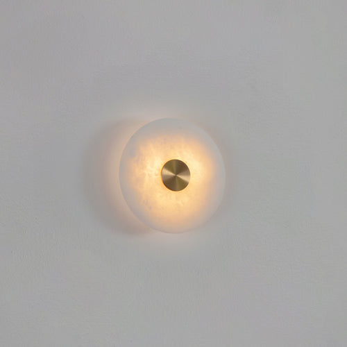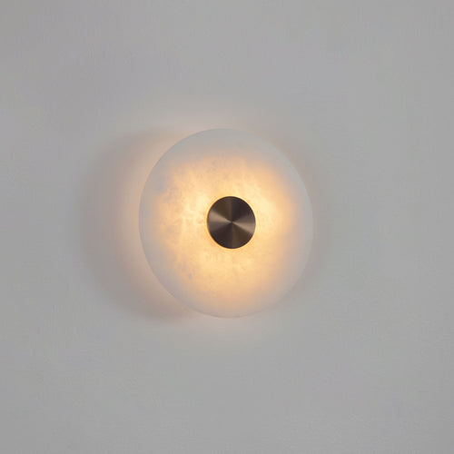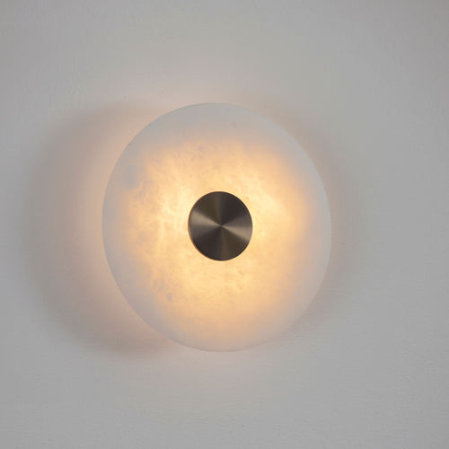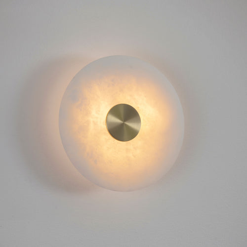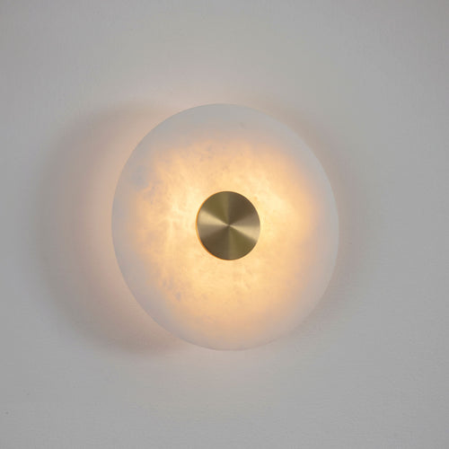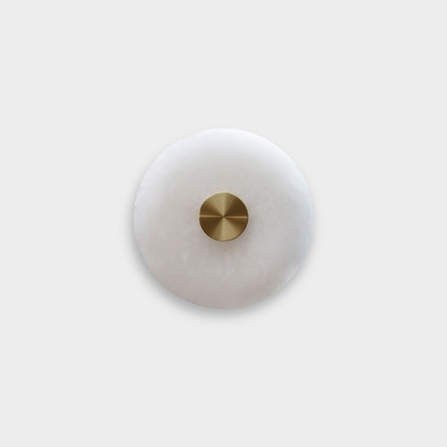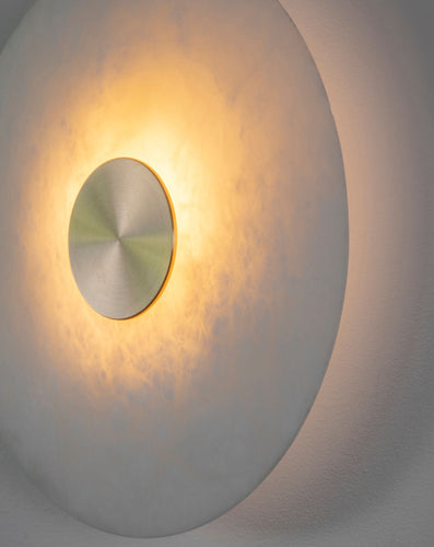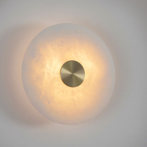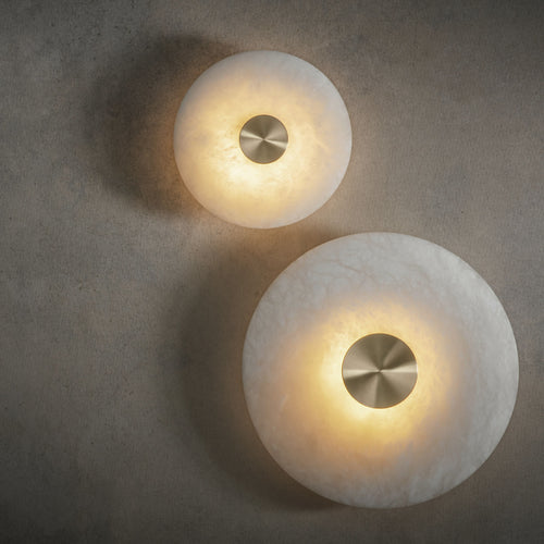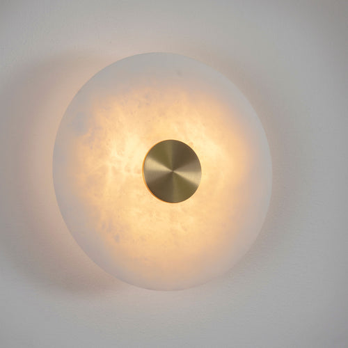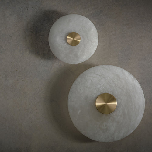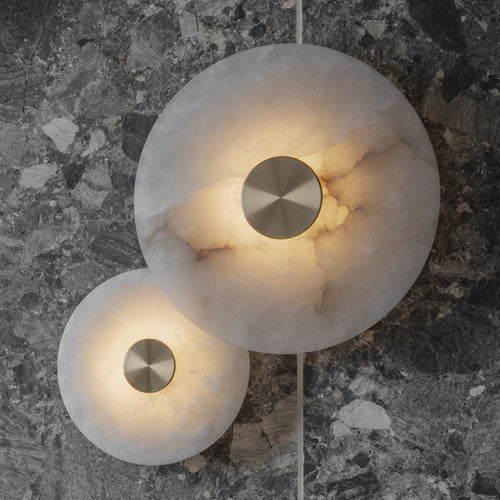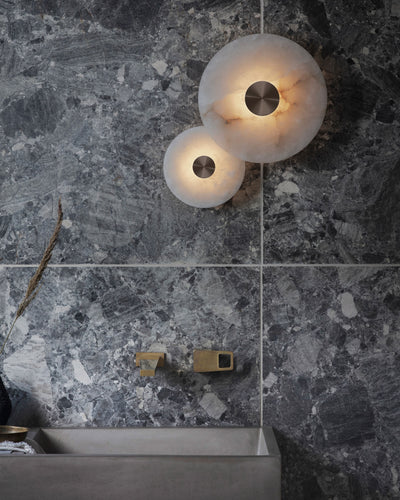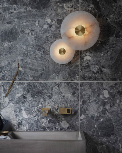 The Bide wall light by Bert Frank merges traditional raw materials such as brass and alabaster with modern engineering techniques, resulting in a harmonious blend of grace and durability. Alabaster is a natural stone and therefore each piece will feature unique veining and detailing. IP65 rated, suitable for wet areas.