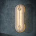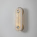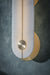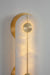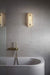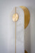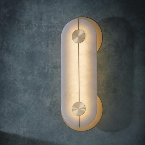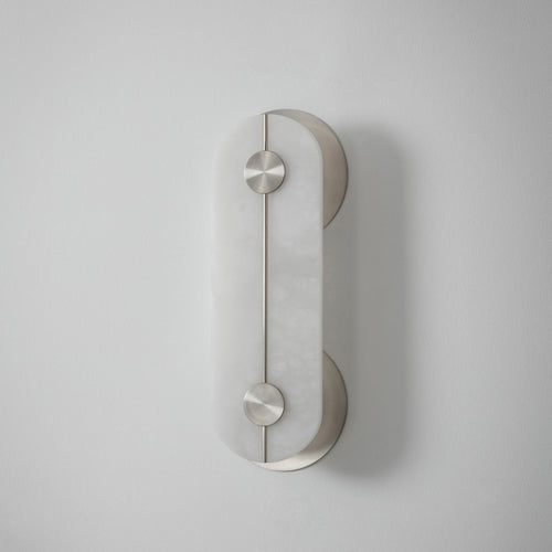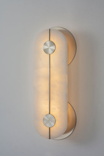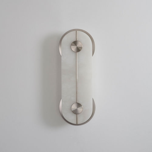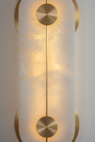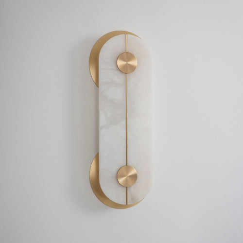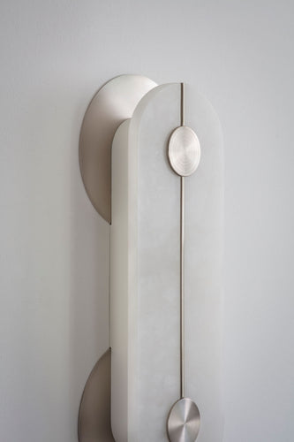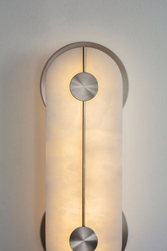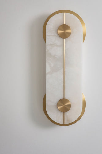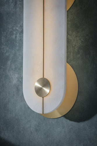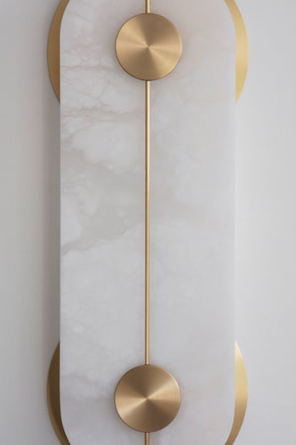 Natural veined alabaster shade ‘braced’ by brushed brass bobbins. Characterised by symmetrical, geometric details. Designed to cast both a warm wash of light across the wall and illuminate into the room.