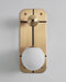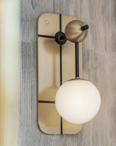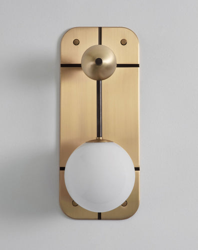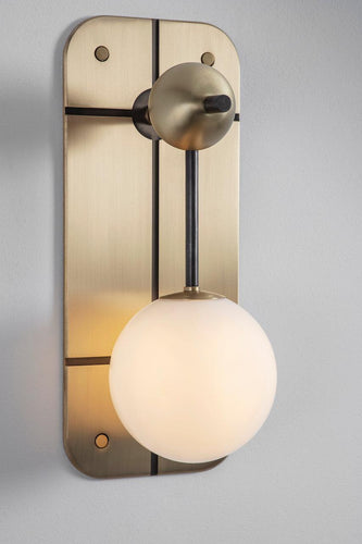 The Rift wall light by Bert Frank is an frosted glass globe which hangs below a brass sphere pinned to a solid brass back-plate with bold, geometric cut-out detail. Soft light plays out into the room while bounding off the brass.
