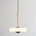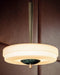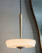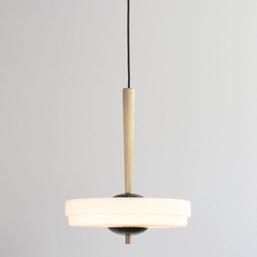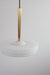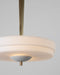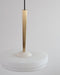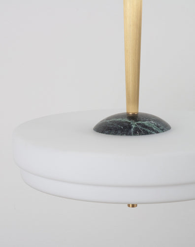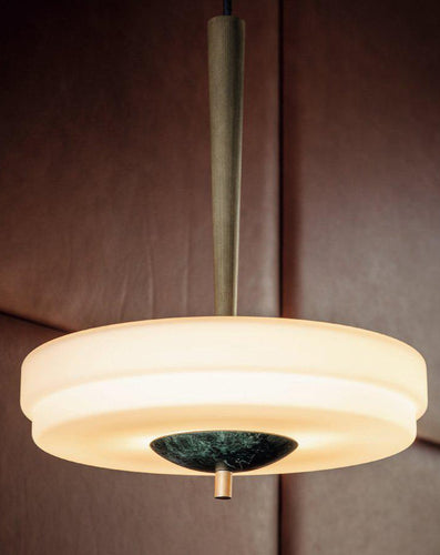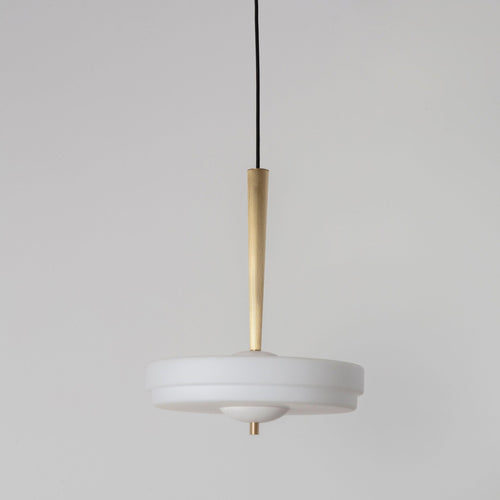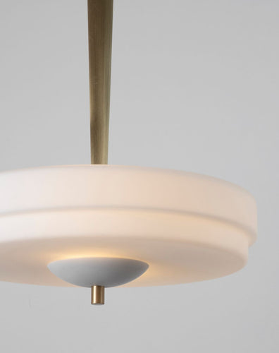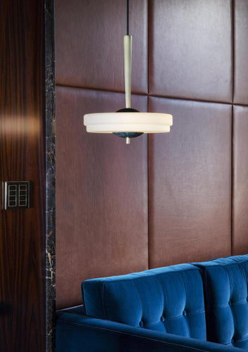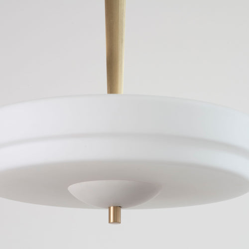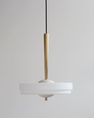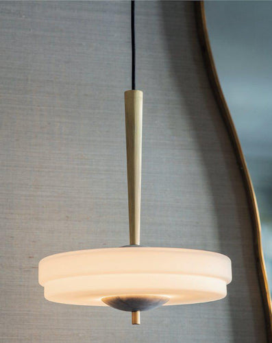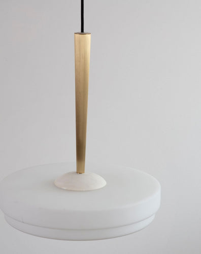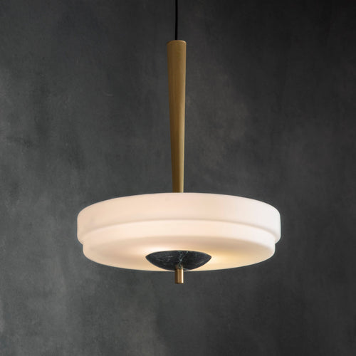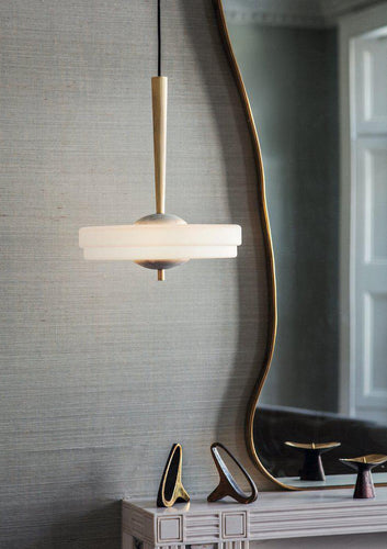 The Trave pendant light by Bert Frank is suspended from a reeded, fluted brass stem, the two-tier, soft-finish, opal glass shade with spherical marble detailing produces a soft, ambient light. Warm and welcoming.