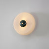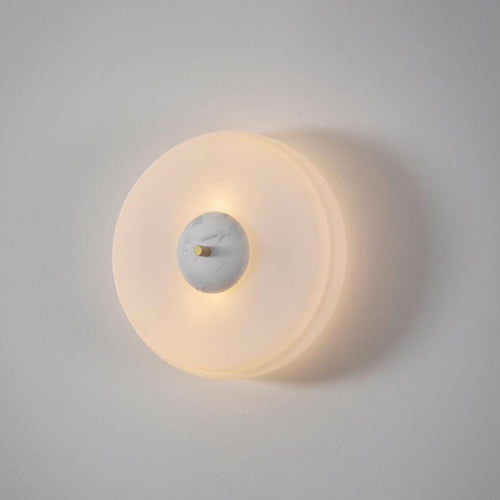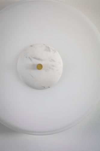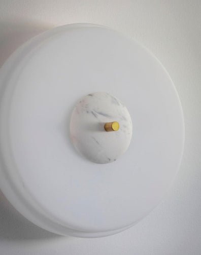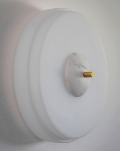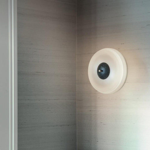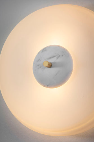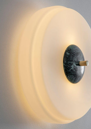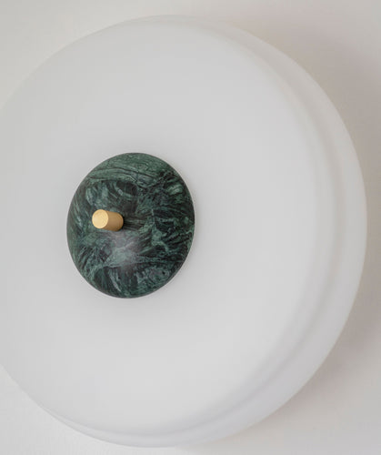 The Trave wall light by Bert Frank is a flush-fitting opal glass shade with central dome of polished marble – white Carrara or green Guatemala – held in place by a brass finial. A striking light that adds warmth and ambience to any room.