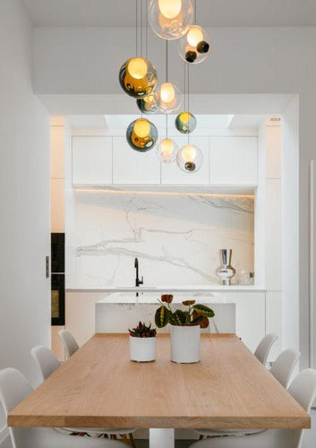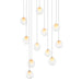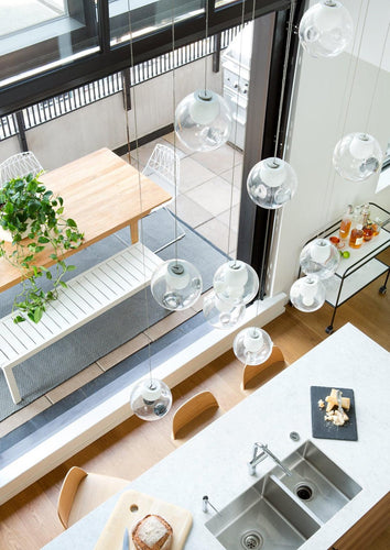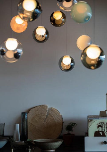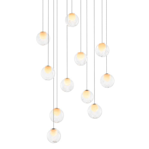 28.11 is comprised of 11 hand blown glass pendants which attach using a fixed length headphone jack connection to a round, rectangular or square white powder coated canopy. The LED bulbs are mains dimmable and the power supply is housed in the canopy.