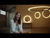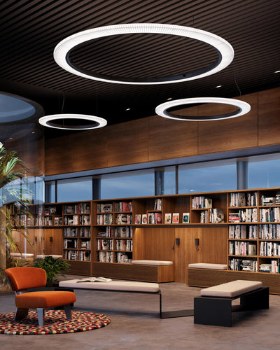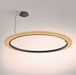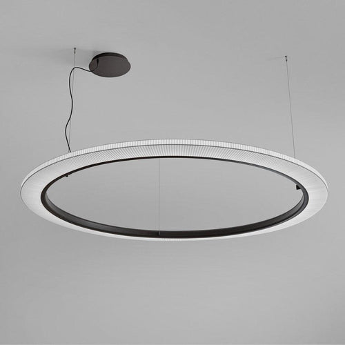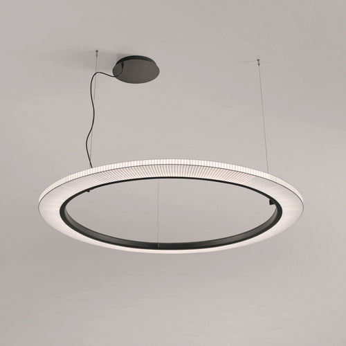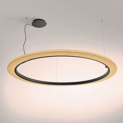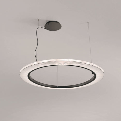 The Bover Roda Horizontal Suspension Light is characterized by its large, cylindrical, ring-shaped shade. Its inner contour is surrounded by an aluminum ring housing a continuous circle of LEDs, emitting a uniform, filtered light. The warmth of the ribbon is highlighted by the dark ring outlining the perimeter, making these fixtures particularly cozy and lightweight, because despite their large volume, they seem weightless.
