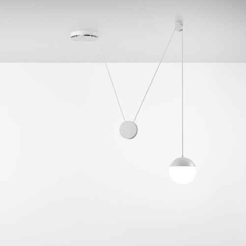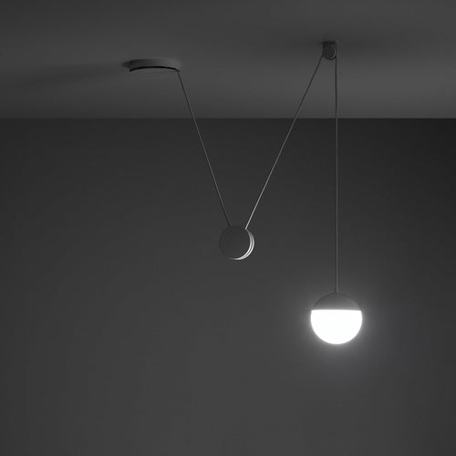 The counterweight is precisely calibrated to the specific weight of the light, so adjusting it is safe and easy. A round LED panel and diffusor plate are situated beneath a shade of matte glass, which conceals the internal parts and thus preserves the silhouette of the light. The metal components also come in a matte finish and are combined with a textile cord for a uniform look. The colour scheme is always monochromatic to underline the graphic character of the lights, and the glass shades are rendered in elementary geometric shapes – sphere, cone, and capsule.