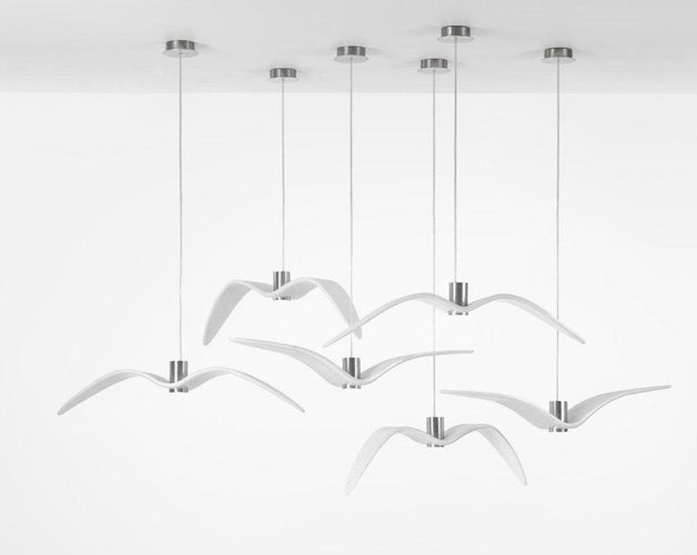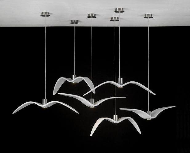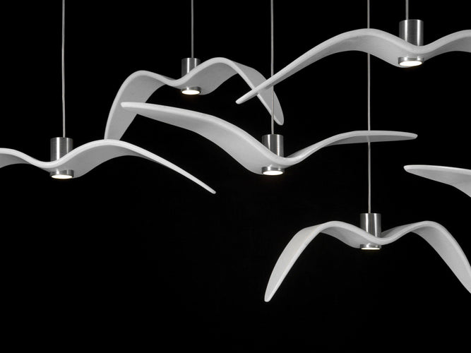 The collection’s restraint and directness are underscored by the minimalist LED light source set in a body of lacquered and polished aluminium. The Night Birds collection comprises three lights with different wing attitudes depicting the various phases of bird flight. The lights are available in white and dark variants.
