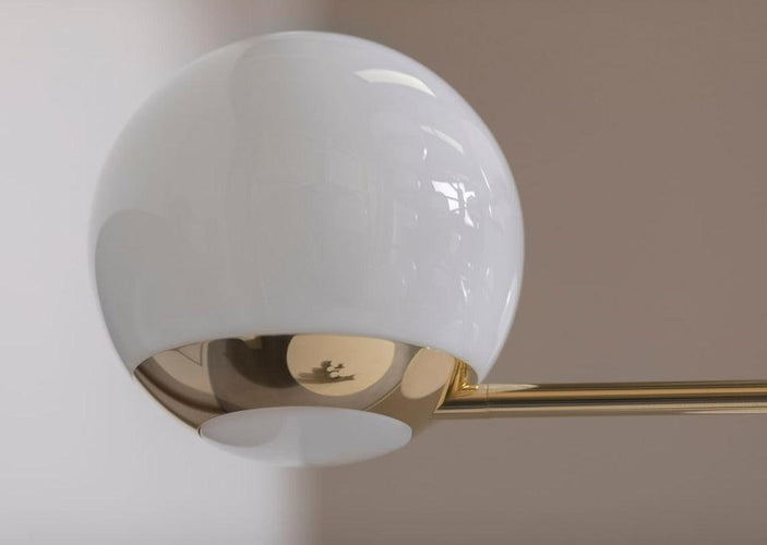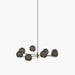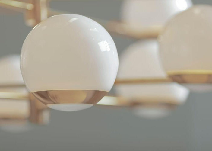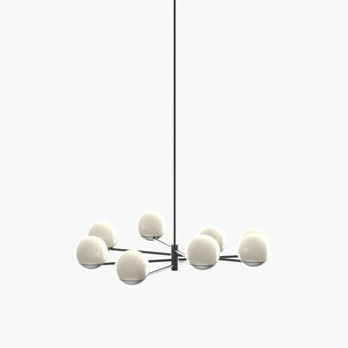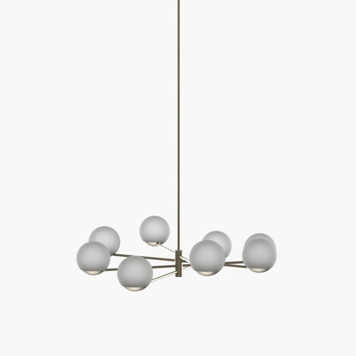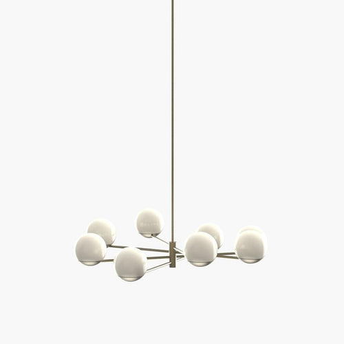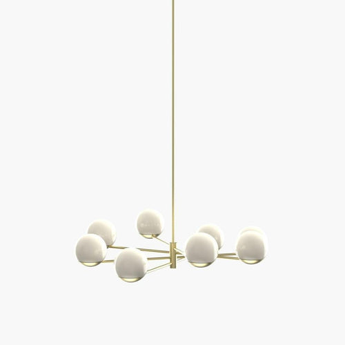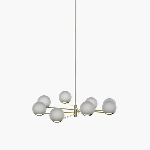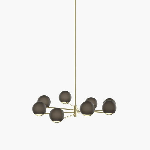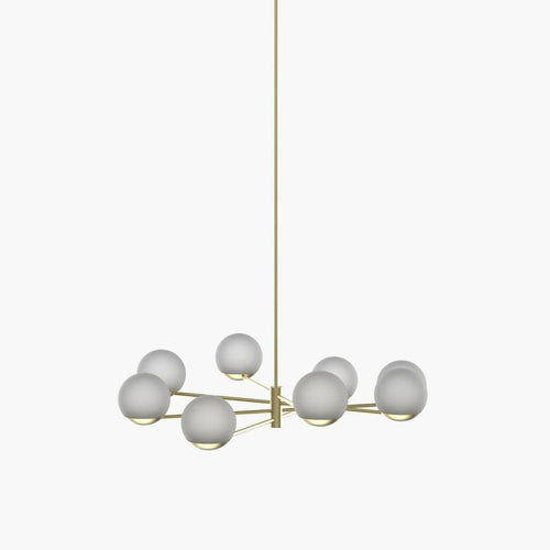 The Ball & Hoop S19 - 02 chandelier by Empty State is machined from solid brass or aluminium. A tiered brass frame holds illuminated glass orbs. Available in a variety of states, glass colours and frame finishes.