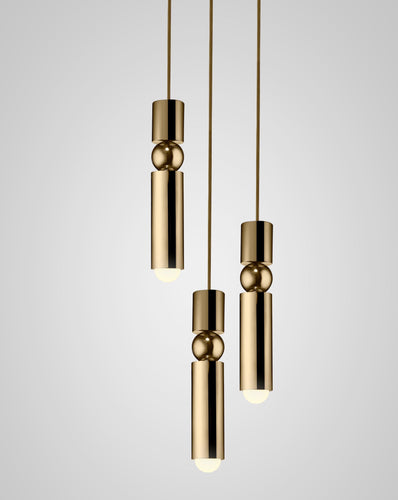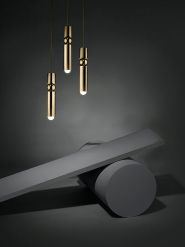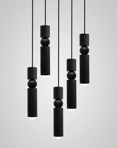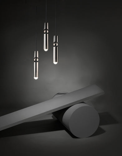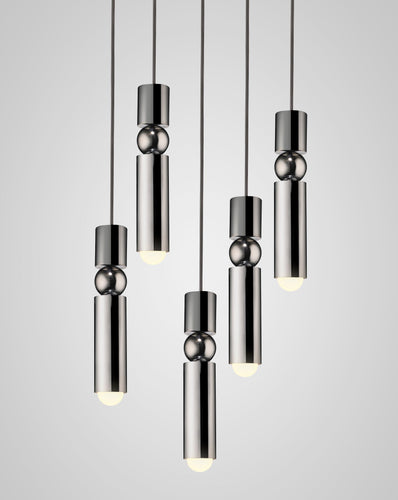 The Fulcrum chandelier, by Lee Broom, features three or five Fulcrum Lights suspended at set lengths from a matching finish ceiling plate and creates a dramatic cluster that is simple to install.