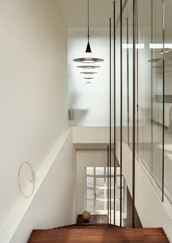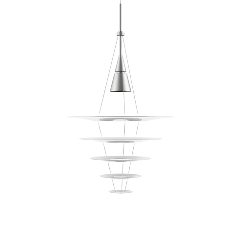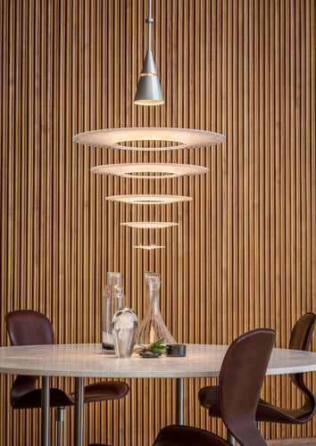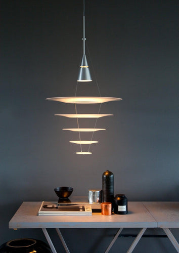 Enigma 545 was designed by Japanese designer Shoichi Uchiyama in 2003. Uchiyama presented a design idea to Louis Poulsen which deconstructed the traditional chandelier concept into slim layers of concentric circles. This involved floating shades held by ultrathin wires, providing a transparent and light expression. The name enigma stands for ‘mystery’, referring to the fact that the shades appear to hover when viewed illuminated from a distance.