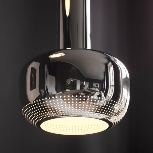 The VL 56 pendant light by Louis Poulsen emits downward directed glare-free light. The radial perforation pattern around the opening creates a softer transition between light and darkness. The perforations create a soft beautiful pattern of light both on the shade and on the surrounding surfaces.