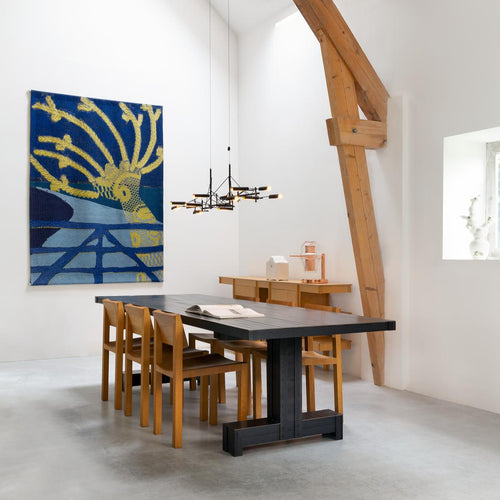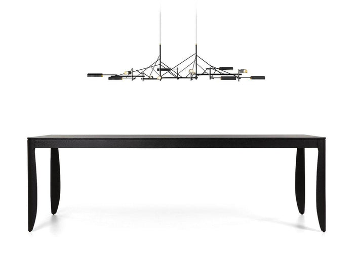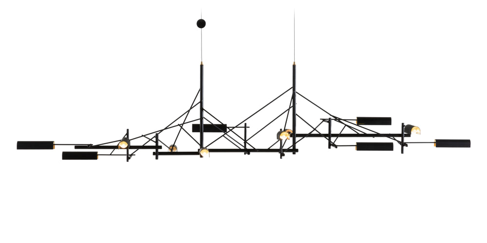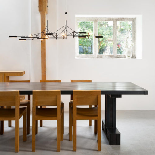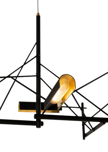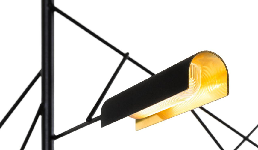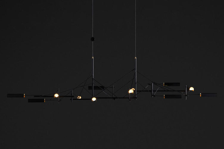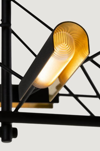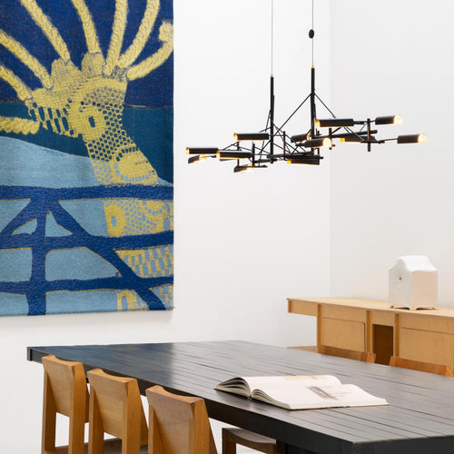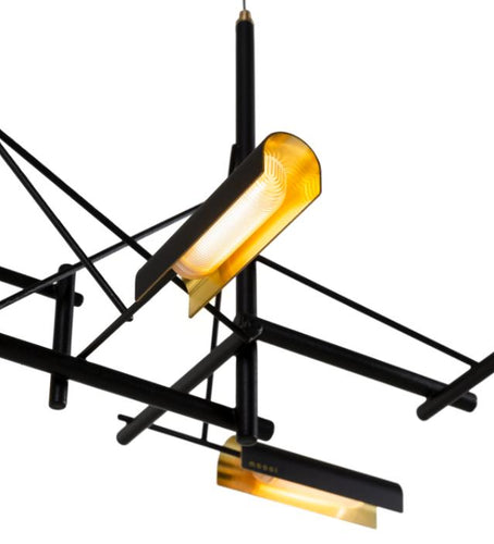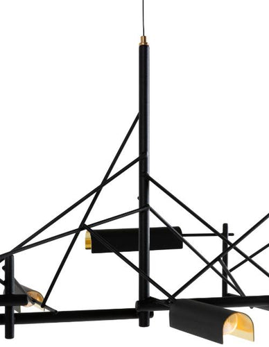 This Moooi suspension light captivates its spectators through a rhythmic composition that is made from black coated stainless steel and brass. The light caps are individually adjustable and make this lamp suitable to be installed above a table or a desk. Available in two sizes. Designed by Joost van Bleiswijk.