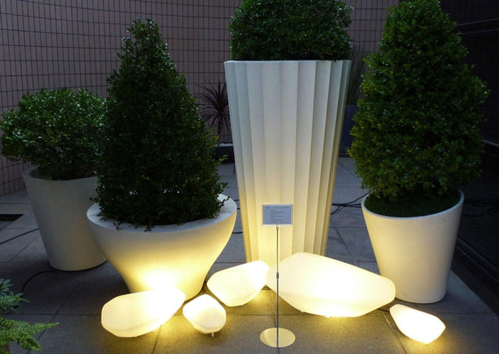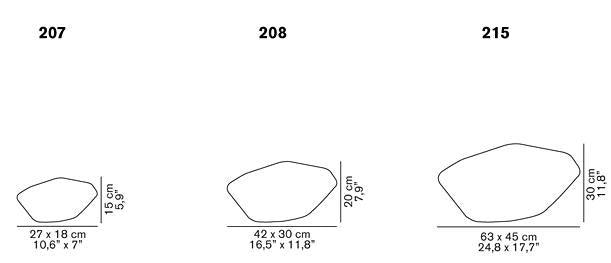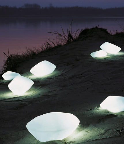 The Stones outdoor floor lamp by Oluce has shapes that are inspired by nature. These luminous stones, available in three different sizes, can be positioned, either alone or together, in the greenery of a garden or the intimacy of a summer terrace, to create an interplay of diffuse, captivating light.