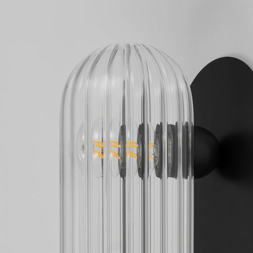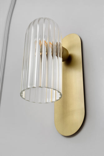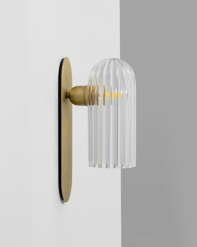 To display its graceful design, this illuminated fixture features a brass medium-sized plate seamlessly paired with a one-sized glass arched cloche, crafted from break-resistant borosilicate glass.