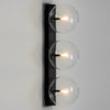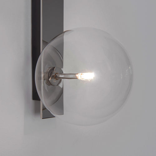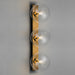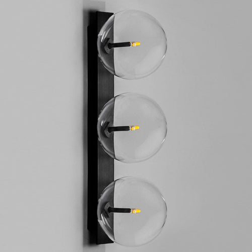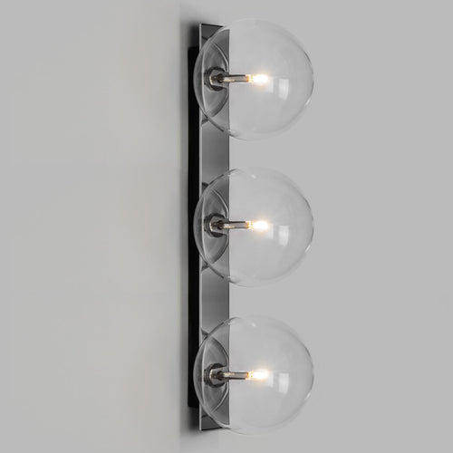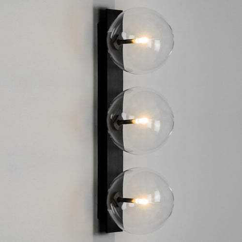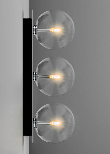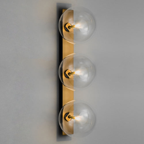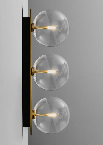 The Oslo Triple by Schwung is a modern wall light that will make a subtle yet striking statement in any residential or commercial interior. Three glass bubbles alight upon a slender rectangle of brass for an essential design. Inspired by the sober compositions of mid-20th century Norwegian artist Ragnhild Keyser, the unique surface curvature of the mouth-blown globes lends a subtle optical distortion to minimalist lines.