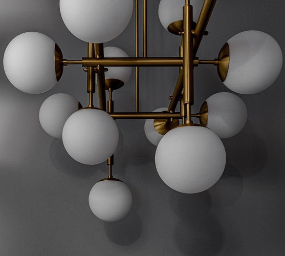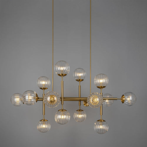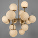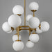 The contemporary Riegel chandelier by Schwung will make a subtle yet striking statement in any residential or commercial interior. A playful pattern of organized segments tells a story of sophisticated spheres enlivened with brass lines. The enchanting structure of mouth-blown orbs creates a shape-shifting form that changes from each view.