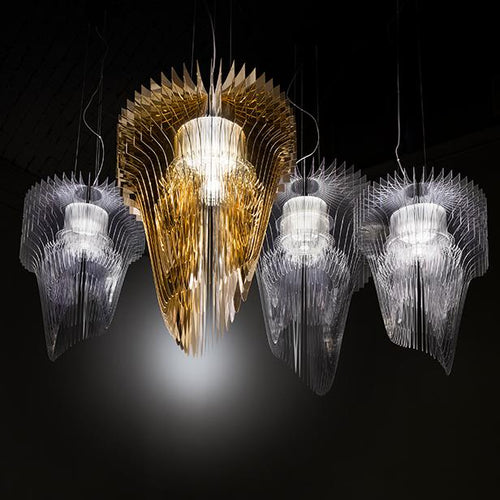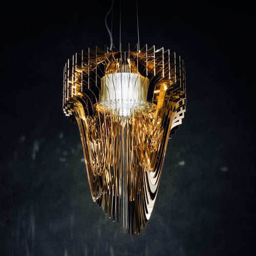 The epitome of modern luxury and grandeur, the Aria Gold Suspension Light, designed by Zaha Hadid for SLAMP, is a beautiful and lavish lighting design.
