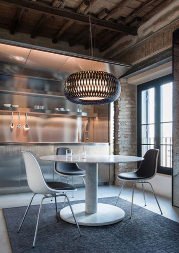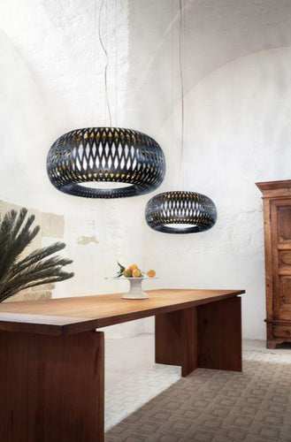 The Kalatos Suspension Light by Slamp is inspired by the art of weaving, Kalatos revisits these archetypes with a modern take using Slamp’s advanced technopolymers; the collection has both suspension and ceiling versions. They come in two colour combinations: matte black with an internal gold finish, or Prisma (white with transparent Lentiflex®).