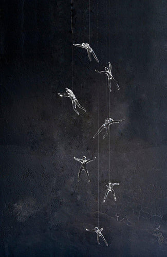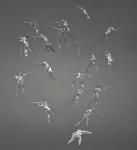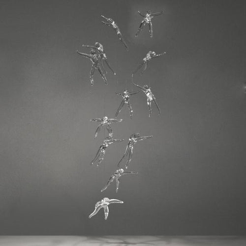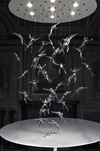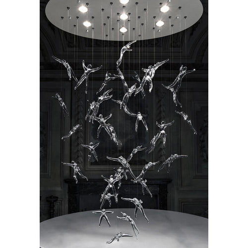 The Angel Falls Suspension Light by Terzani. This stunning light features a cluster of heavenly angels, cast in mid decent. Handmade from 24% lead crystal, the angels are illuminated by halogen lamps that are inset into the canopy, creating a beautiful arrangement of shadows on surfaces underneath the fixture.