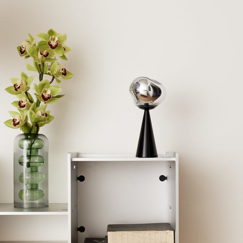 The Melt Portable table lamp, by Tom Dixon expands the collection, offering the same mesmerizing hot-blown glass effect within a portable design. Melt is evocative of molten glass, the interior of a melting glacier or images of deep space. Melt Portable LED is available in a wide range of finishes and offers up to 10 hours of battery life.