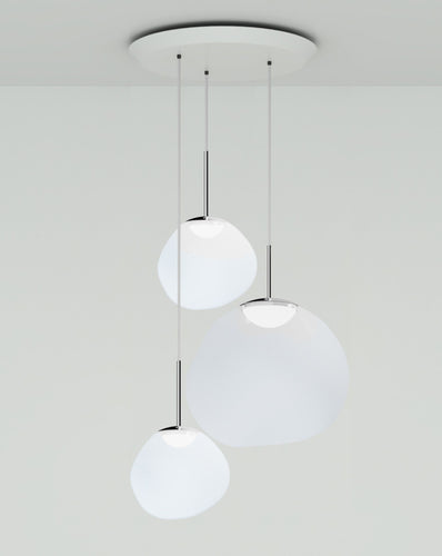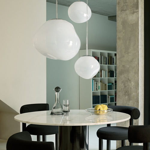 Each light is a bold statement in its own right but Tom Dixon's lighting often sits best in multiples. The Tom Dixon Melt LED Trio Round Pendant System offers endless reflections, spatial play, and graphic arrangements that showcase the cluster of three extraordinary Melt Pendants (two mini and one large). The Trio is easy to install, comes with a round ceiling canopy and is available in Opal, Gold, Smoke, Chrome or Copper.