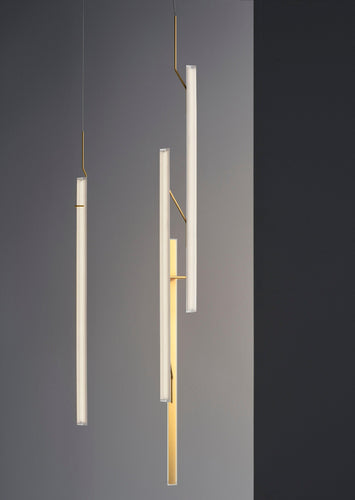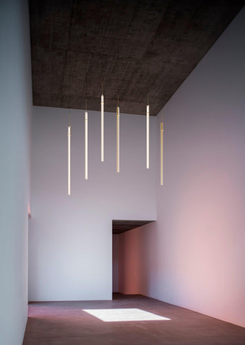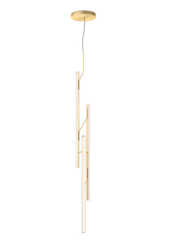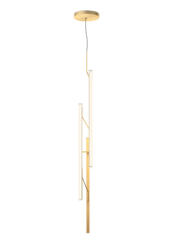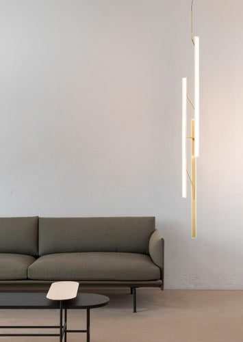 The Halo Jewel Straight pendant light by Vibia is available in gold or black finish. Providing an ambient or indirect light through its vertical methacrylate diffuser. The diffuser is supported by a fine grade steel structure. By combining several units of differing heights a more dynamic effect can be achieved for larger spaces.